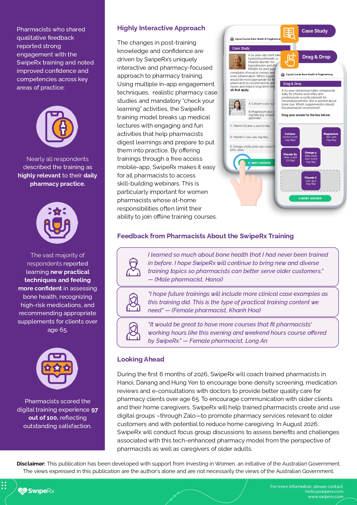 To address this gap, with support from Investing in Women, an initiative of the Australian Government, SwipeRx offered the first training for pharmacists, designed to improve elderly healthcare at community level and ease unpaid caregiving responsibilities and stress. Together with Vietnam’s National Geriatric Hospital and the Vietnamese Pharmacy Association, SwipeRx delivered the first nationally accredited digital geriatric training for pharmacy professionals achieving the following results in 8 hours: